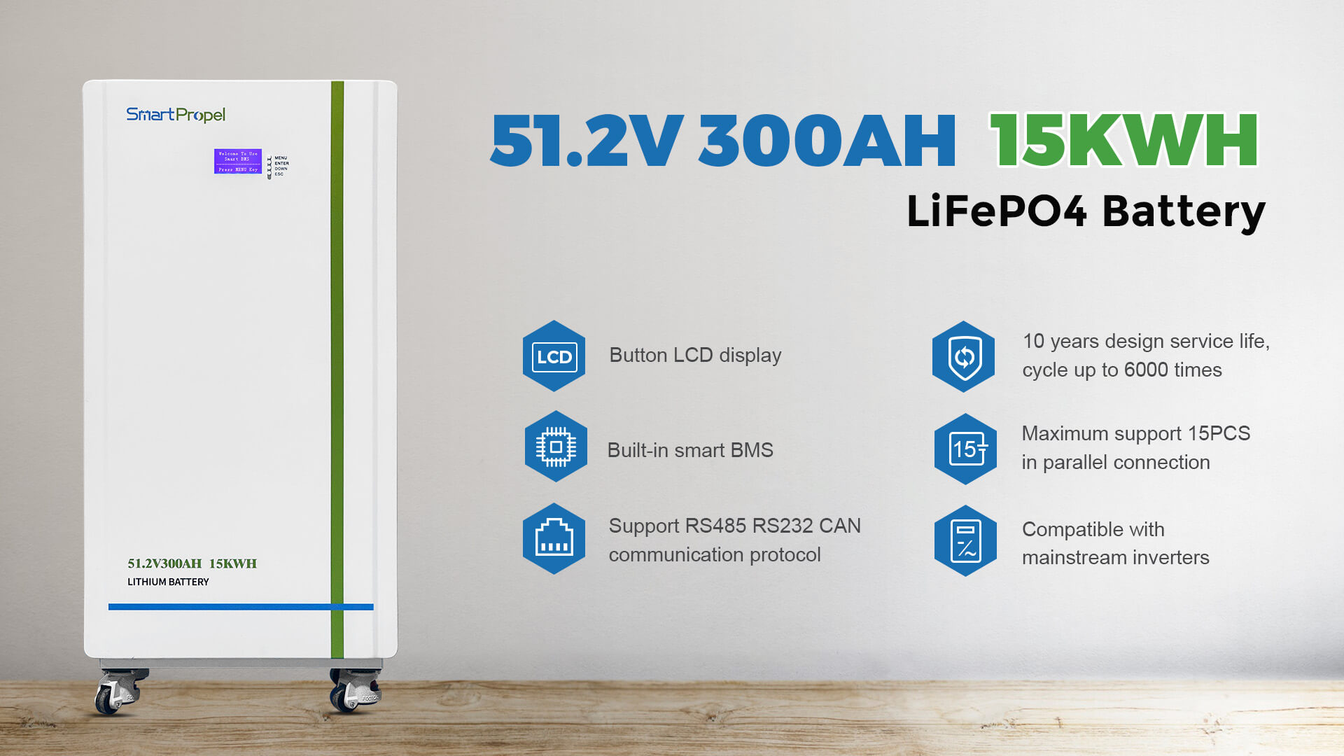 The 51.2V 300AH (15kW) Lithium Iron Phosphate battery is built for high-demand applications, providing robust storage for large homes, commercial properties, and off-grid systems. Offering superior lifespan, rapid charging, and unmatched safety, it ensures uninterrupted power and optimized use of solar energy. Ideal for users requiring maximum capacity and reliability.